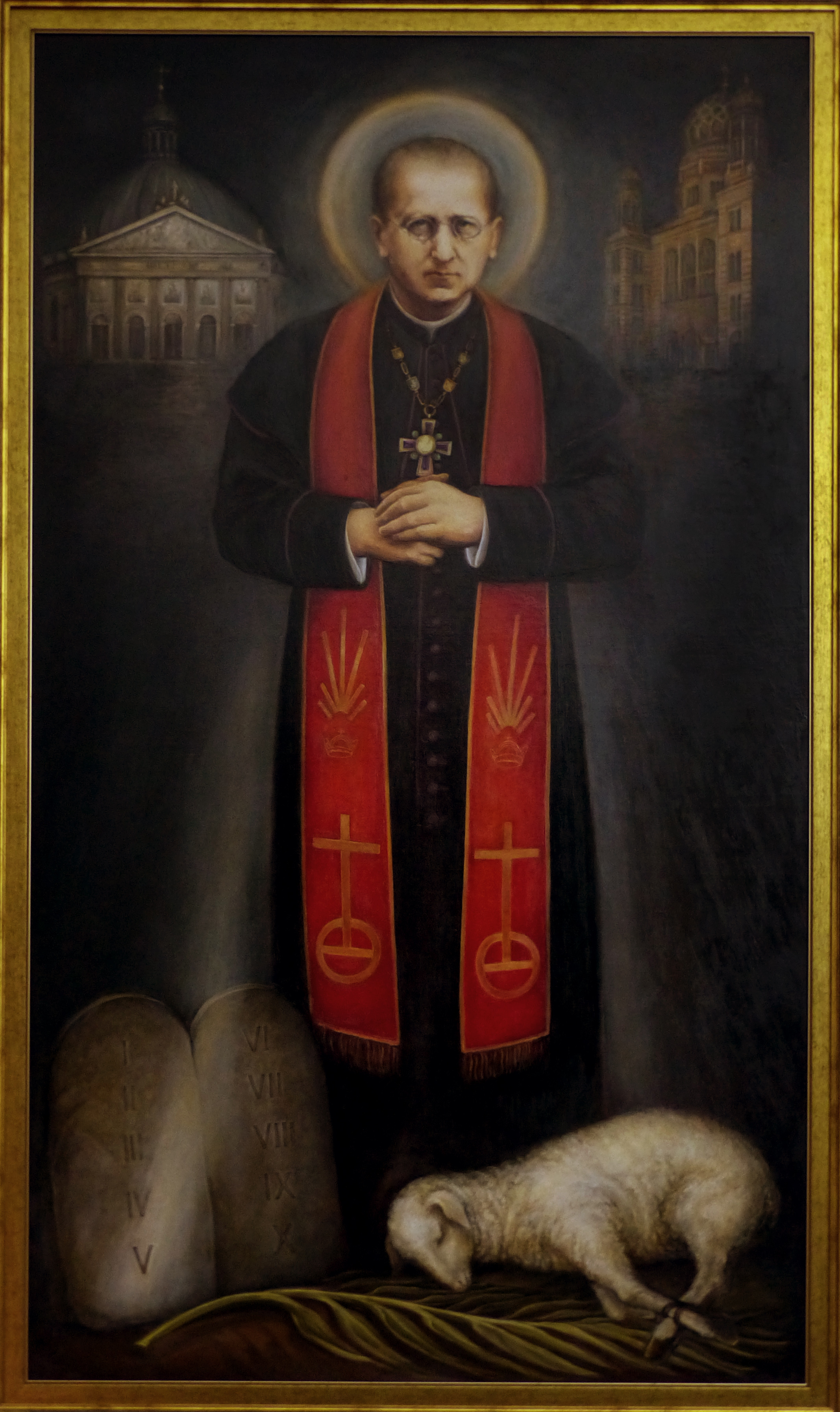 Wallfahrtsbild von Malgorzata Drozdowicz: Seliger Bernhard Lichtenberg 1875–1943. Ölgemälde auf Holz mit Rahmen : 100 x 160 cm. St. Hedwigs-Kathedrale Berlin.